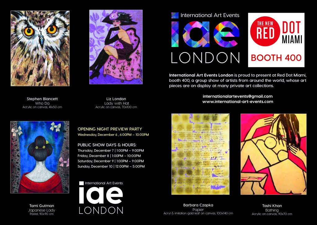 By nexthype / January 23, 2017 SHOW DAYS & HOURS Thursday, December 7 | 1:00PM – 9:00PM Friday, December 8 | 1:00PM – 10:00PM Saturday, December 9 | 1:00PM – 9:00PM Sunday, December 10 | 12:00PM – 5:00PM [pl_section section=”embed” id=”1569307278″] Red Dot Miami 6 - 10 December 2017 INTERNATIONAL ART EVENTS -LONDON -BOOTH 400 OPENING NIGHT PREVIEW PARTY Wednesday, December 6 | 6:00PM – 10:00PM